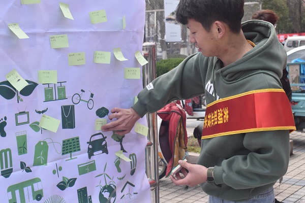 活动伊始,前来参加的师生络绎不绝。志愿者们一方面积极为同学们科普低碳知识,倡议大家从点滴做起实现绿色生活、保护校园环境;另一方面号召更多的同学加入志愿者行列,以实际行动宣扬低碳环保理念、推进绿色校园建设。在志愿者们的感染下,在场学生积极响应,纷纷将想说的话写在便签上,并贴在宣传栏,表达自己对建设绿色校园的支持、决心以及美好愿景。