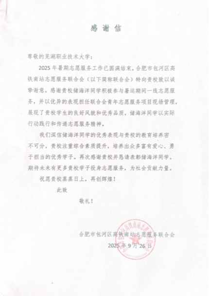 近日,合肥市包河区高铁南站志愿服务联合会致信我校,对我校2023级软件技术专业学生储海洋在2025年暑运期间一线志愿服务工作中的优异表现给予赞扬,对我校的支持表示感谢。