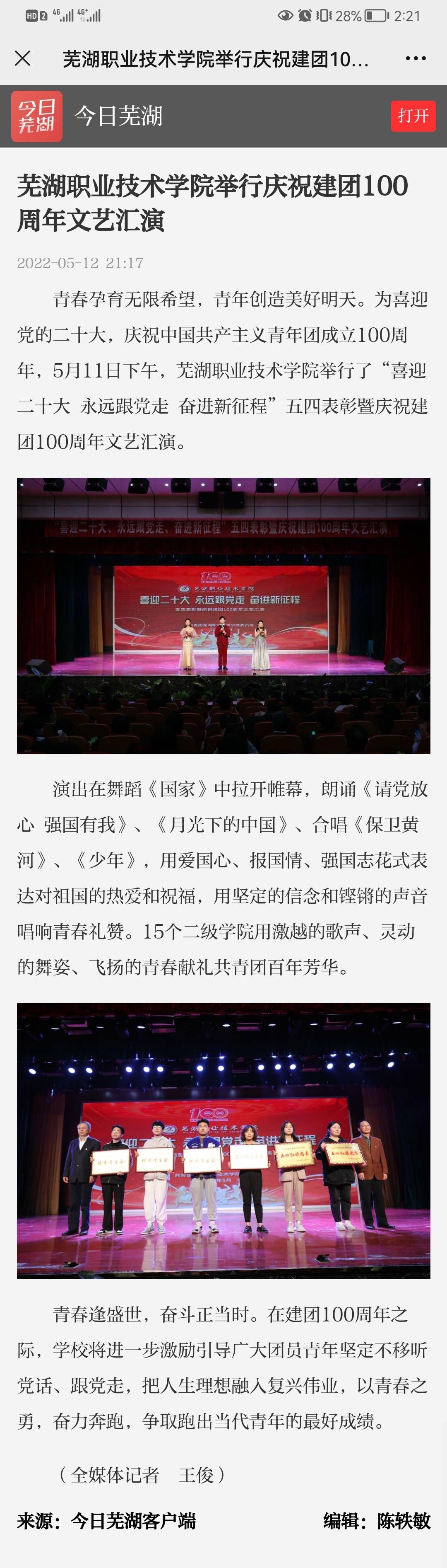 青春孕育无限希望,青年创造美好明天。为喜迎党的二十大,庆祝中国共产主义青年团成立100周年,5月11日下午,芜湖职业技术学院举行了“喜迎二十大 永远跟党走 奋进新征程”五四表彰暨庆祝建团100周年文艺汇演。