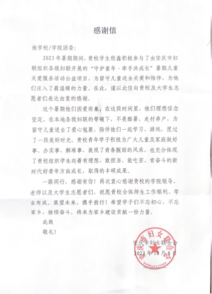 服务社会不仅仅局限于“三下乡”暑期社会实践活动。今后,校团委将以此次收到安庆市妇联的感谢信为契机,持续引导我校青年学子常态化参与各类社会志愿服务,志存高远、脚踏实地,以实际作为在社会服务、地方发展中贡献青春力量。(文、图/晏超 审/刘有新)