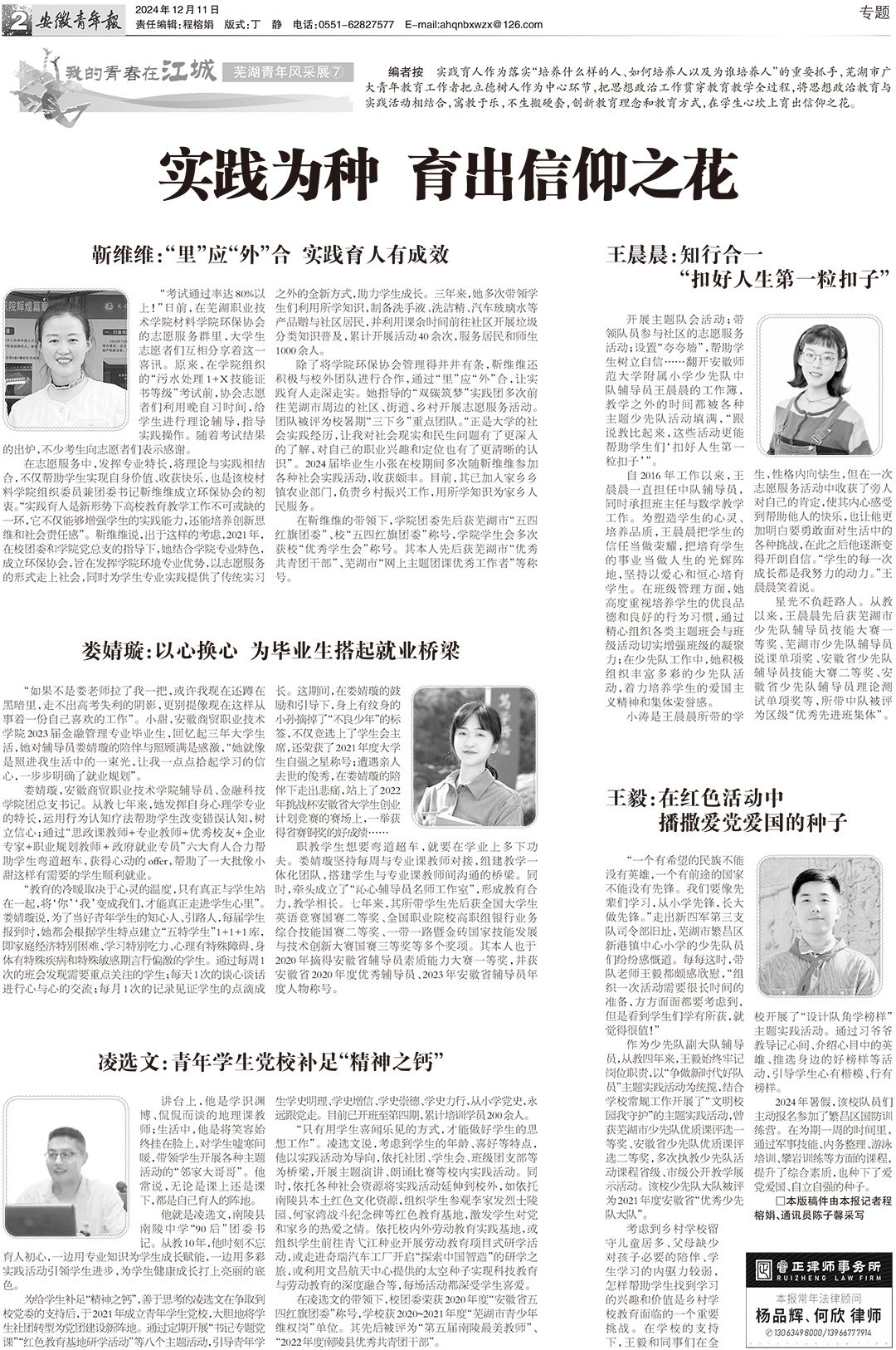 实践育人作为落实“培养什么样的人、如何培养人以及为谁培养人”的重要抓手,芜湖市广大青年教育工作者把立德树人作为中心环节,把思想政治工作贯穿教育教学全过程,将思想政治教育与实践活动相结合,寓教于乐,不生搬硬套,创新教育理念和教育方式,在学生心坎上育出信仰之花。