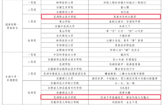 近日,由省委宣传部指导,省文旅厅(省广电局)、省教育厅、团省委、安徽广电集团联合举办的安徽省大学生创意短视频大赛获奖名单揭晓。我校国际经贸学院作品《青春本色响水情深》在“筑梦田野·青春担当”赛道荣获三等奖,食品与生物学院作品《传承千年装裱技艺 彰显传统文化魅力》在“古韵今声·非遗新绘”赛道荣获优秀奖。