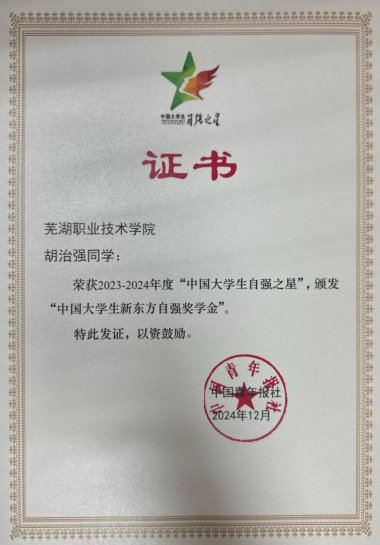近日,由共青团中央、全国学联指导,中国青年报社、新东方教育科技集团、中国青年创业就业基金会联合开展的2023-2024年度“中国大学生自强之星”评选结果揭晓,经学校推报、省级评定、全国评审等环节,我校经济管理学院电子商务专业胡治强同学荣获“中国大学生自强之星”荣誉称号,并荣获“中国大学生新东方自强奖学金”。