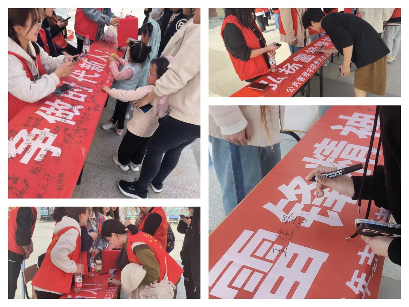 午后时分,温暖的阳光撒在校园的各个角落,启动仪式也缓缓拉开了帷幕。在南校区三食堂门口的活动现场,我院青年志愿者协会精心准备了横幅签字、雷锋知识小问答及志愿服务“盲盒”任务等活动以及精美的小礼品。志愿者们身穿志愿者服装,热情的邀请过往的同学们参与我们的活动。