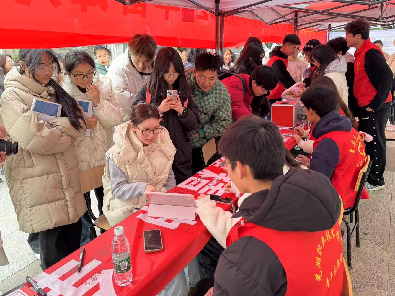 在互动体验区,青年志愿者们策划了一系列以雷锋精神为主题的互动环节。签字环节中,一条写有“弘扬雷锋精神,争做时代楷模”的鲜艳横幅格外醒目,同学们在横幅上郑重签名,以笔寄情,表达传承雷锋精神的坚定信念。雷锋知识问答环节热闹非凡,志愿者们精心设计了涵盖雷锋生平、精神内涵、新时代价值等方面的30道竞答题,现场气氛热烈,师生们踊跃参与。答对者还可获得定制书签、雷锋主题茶杯、雷锋帽等文创奖品。最具创意的“学雷锋盲盒抽奖”环节也排起长队,一个个精美的盲盒整齐排列,盲盒内藏有雷锋名言、志愿服务卡等小礼品,吸引师生积极参与,营造了浓厚的“学雷锋”氛围。