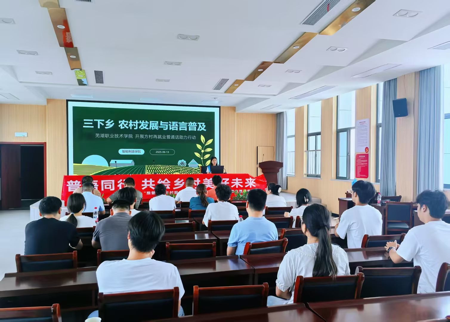 为深入贯彻党的二十大精神,助力乡村振兴战略实施,智能制造学院于2025年7月21日至25日组织两支实践队伍赴芜湖市镜湖区花园村和方村开展暑期“三下乡”社会实践活动。本次活动以“推普助力文化兴农,科技赋能产业振兴”为主题,通过普通话推广与农业技术帮扶双线并行,为乡村发展注入青春力量。